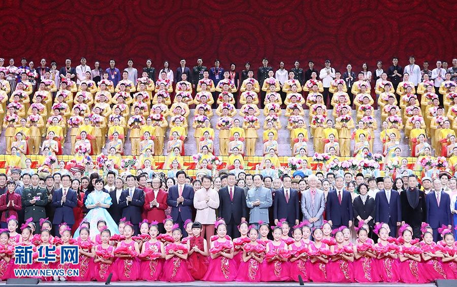 全場起立,共同高唱《歌唱祖國》。習近平等走上舞臺同晚會演職人員親切握手,祝賀演出成功,并與大家合影留念,全場響起經(jīng)久不息的熱烈掌聲。